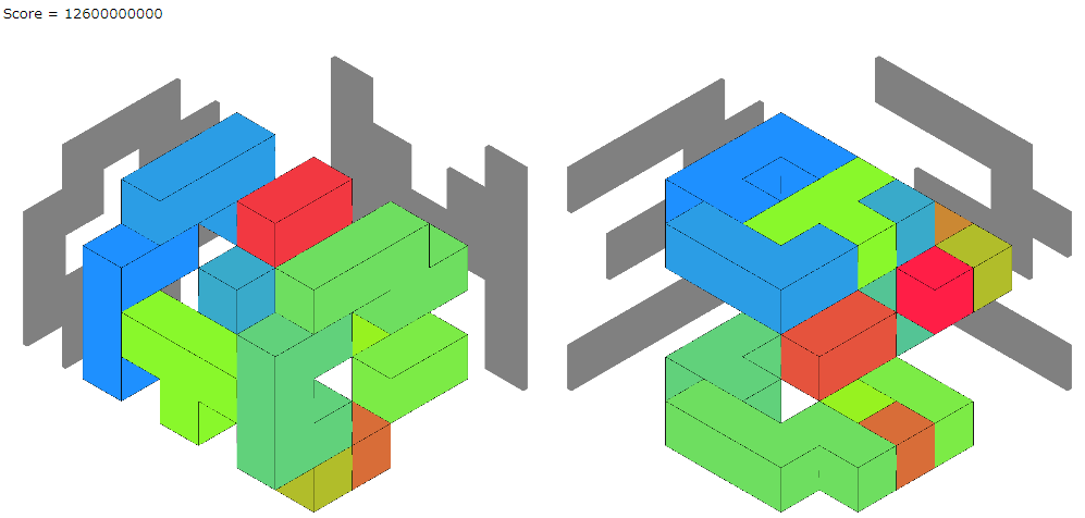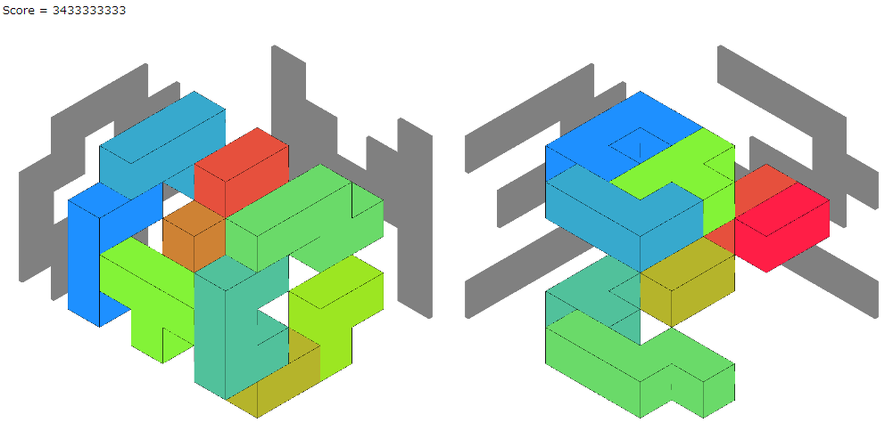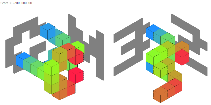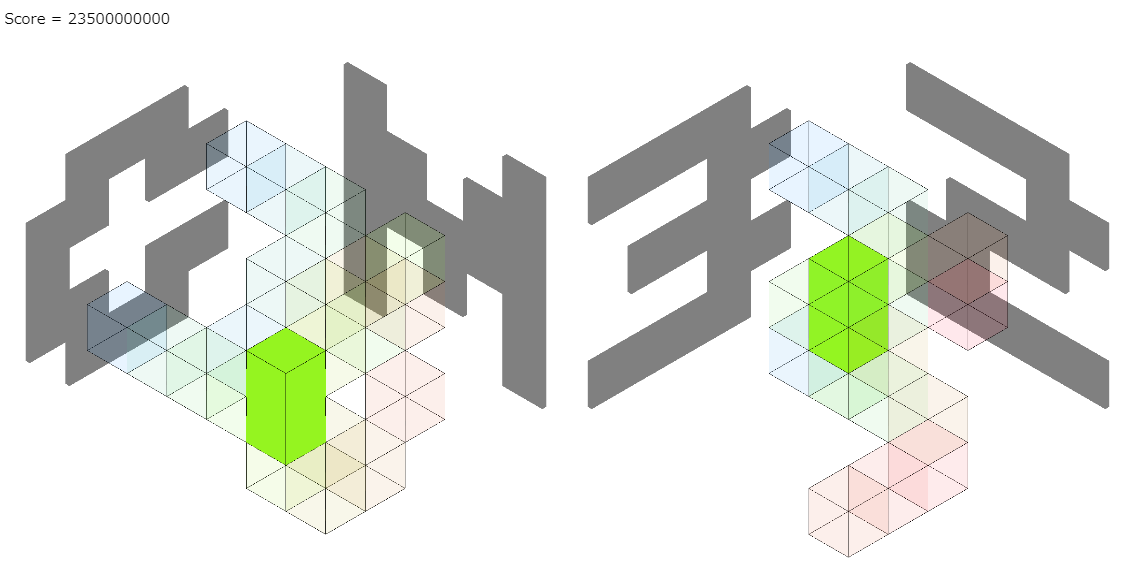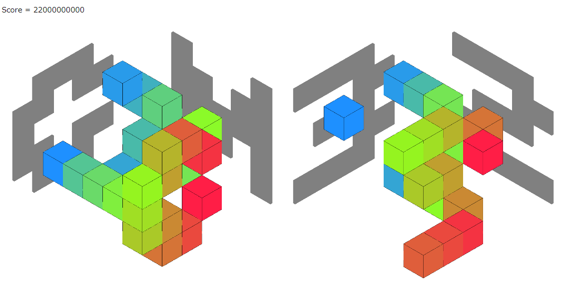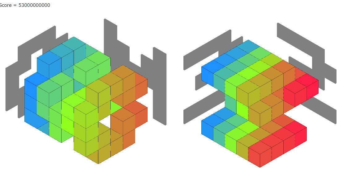 そして、最初にできるだけブロックを削った方が良いスコアになるケースと、ブロックを削らない方が良いスコアになるケースがあったので、両方試して良い方の解を出力するようにしました。seed0のビジュアライザは4個をつなげたブロックが多くなりました。