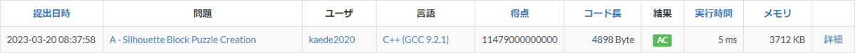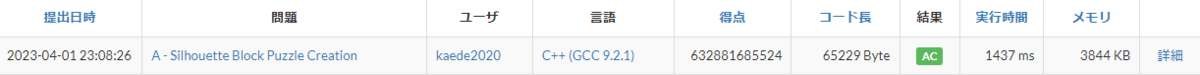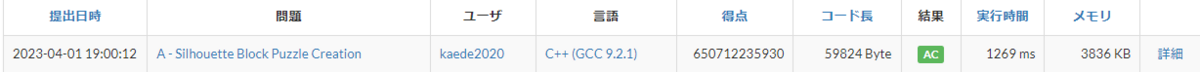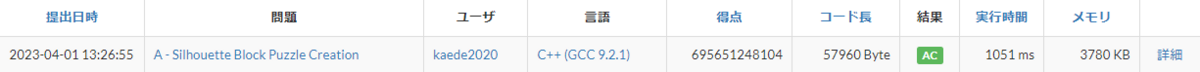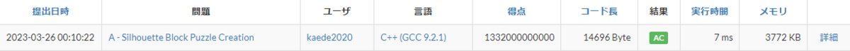 やっと光が見えてきたかもしれません。相対スコアも停滞していたところから、少し良くなってきました。実行時間は646 msで、6sという制限時間は十分に余っています。シルエットの重ね合わせを全て試していきたいと思います。