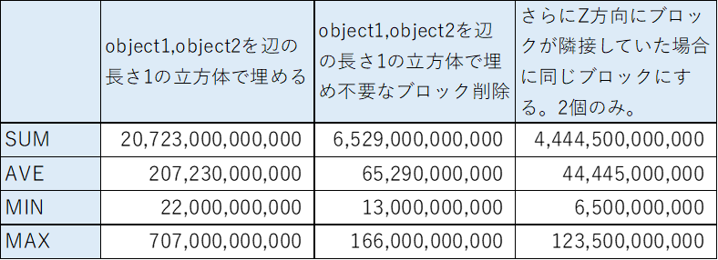 やってみましたが、得点は変わりませんでした。オブジェクト1とオブジェクト2のブロック数を同じにすることと、ブロック数が増えることの重みが同じだったからです。うーん、これは今やることではないなと思ったので、次にいきたいと思います。