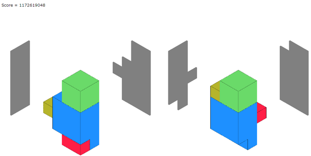 さて、今悩んでいることです。ブロックは回転させることができるのですが、今は同じ方向でしか一致するかどうかを見ることができていません。回転させてみたいと思っているのですが、ブロックの一致判定方法がわかりません。ブロックの一致判定ができないので、スコア計算をするコードも書けていない状態です。今は配布されているWindows用のコンパイル済みバイナリでスコアを計算しています。