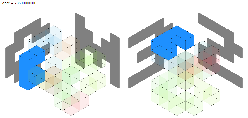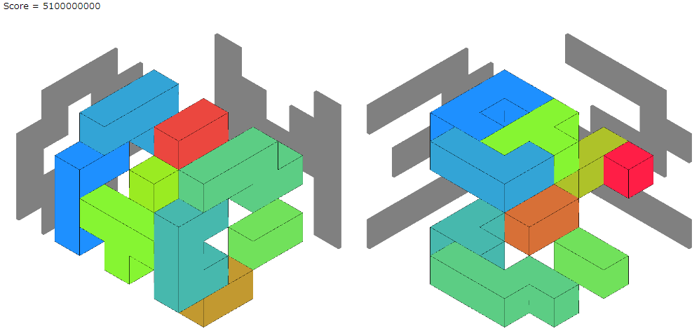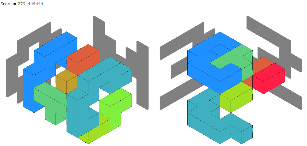 seed0のビジュアライザを見ます。スコアは悪くなっていますが、いろいろな形のブロックが使われているのがわかります。無駄なブロックがあるので、小さなブロックから取り除くということができればと思います。