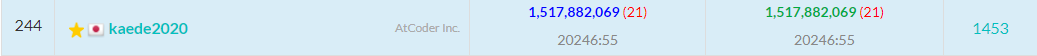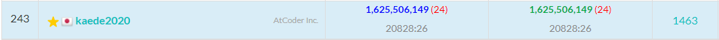 ここでうっかり、ローカルと提出時の実行が異なるものを出してしまい、待つこと30分。もう1度提出しました。絶対スコアは、695,651,248,104になり、相対スコアは1,517,882,069、739人中244位になりました。順位はあまり良くなっていないものの、少しずつスコアが良くなっているので、うでしいです。
