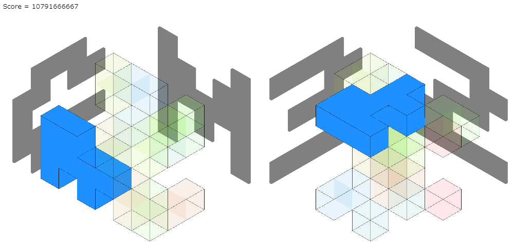 seed1で11個のブロック(体積13)の差ができているので、これを解消することを考えます。ビジュアライザを見ます。余った体積1のブロックを2個くっついたブロックにつなげて、3個にすることができそうです。