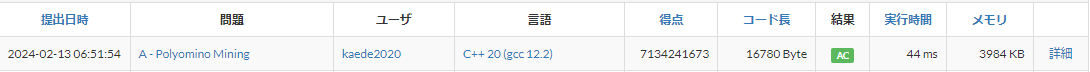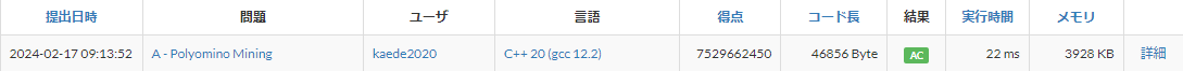 と思ったのですが、念のために1000テストケースをまわすと、大量のTLEが発生しました。空っぽの答えを提出していることがあるようです。修正して今度こそ最終提出をします。